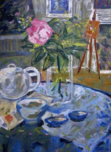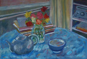 2021Stilleven met rose rozen en theepot.