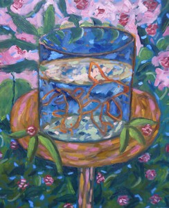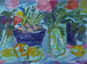 2022Stilleven met goudvissen, bladeren en bloemen, geïnspireerd door Matisse.